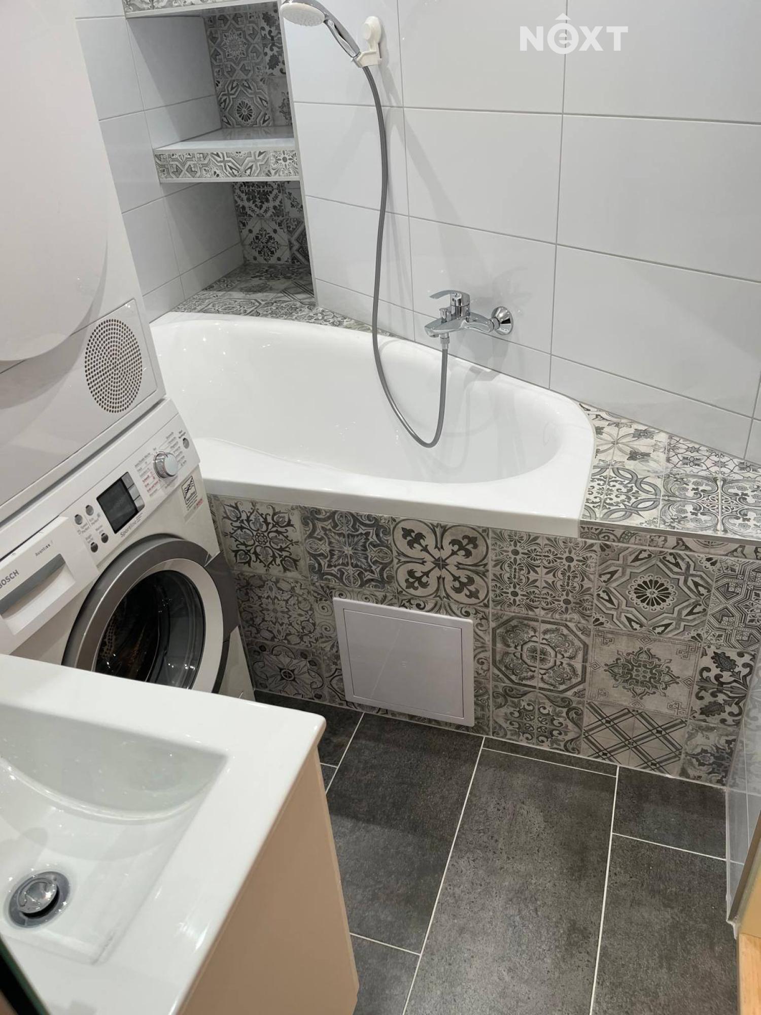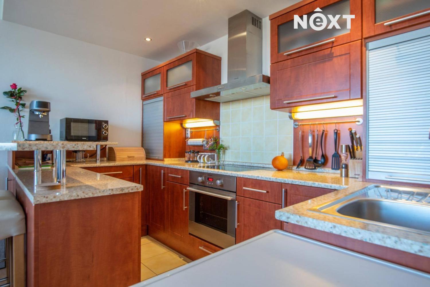 Velkou výhodou je vybavenost bytu – moderní kuchyňská linka se spotřebiči, pračka se sušičkou i vestavěné skříně jsou součástí, takže můžete bydlet okamžitě a bez starostí.
