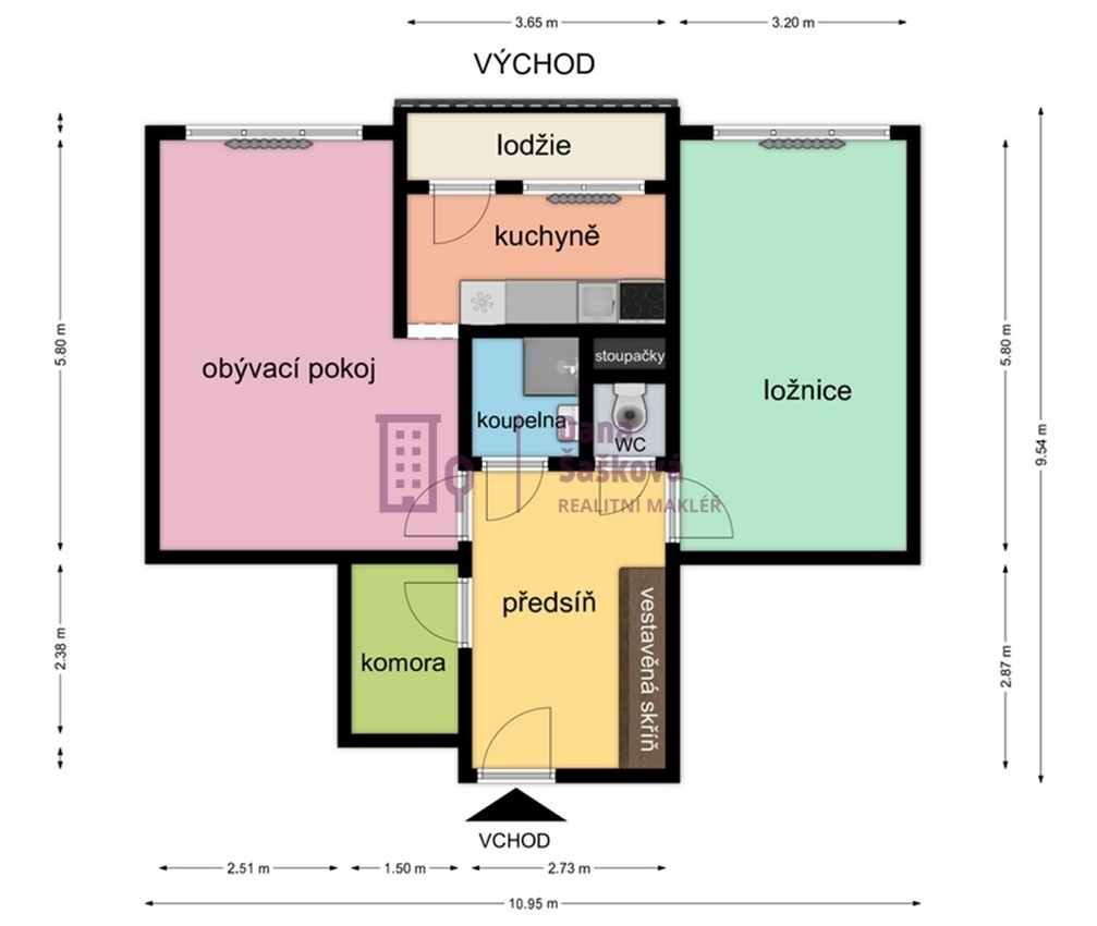 Dispozice 2+1 nabízí předsíň, komoru, koupelnu se sprchovým koutem, samostatnou toaletu, ložnici, obývací pokoj a kuchyni se vstupem na lodžii.